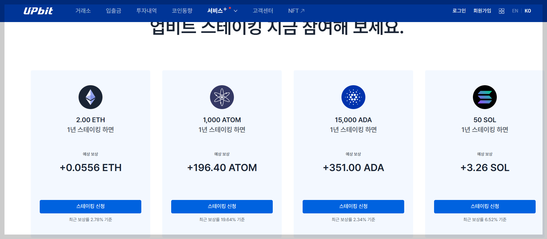 물론 스테이킹은 꼭 업비트에서만 진행할 수 있는것은 아닙니다. 스테이킹을 위한 플랫폼인 리도(Lido)나 해외 코인 거래소인 바이낸스(binance)에서도 가능한데요. 이번 포스팅에서는 대략적인 개념을 알아보는 것이기 때문에 가독성이 좋은 업비트를 기준으로 살펴볼게요.