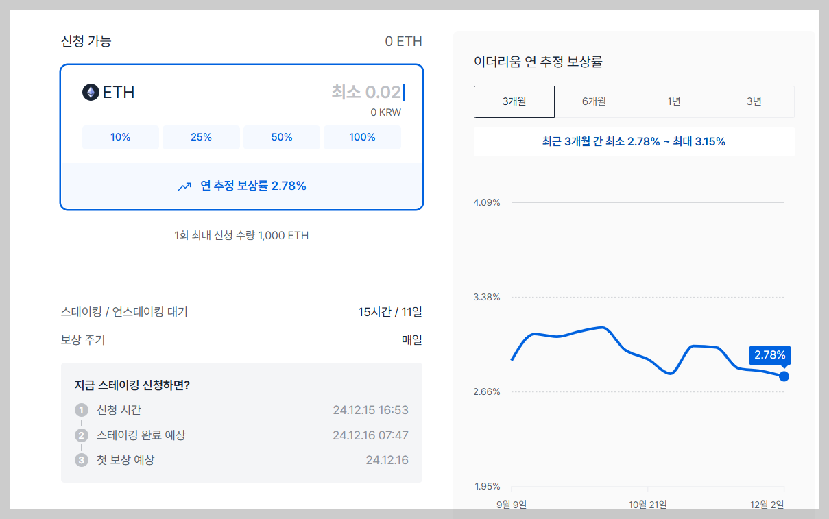 제가 확인한 2024년 12월 중순 기준으로는 업비트를 통한 이더리움 스테이킹 예상 보상률은 2.78%네요. 2ETH를 1년동안 스테이킹한다면 0.0556 ETH를 보상으로 받을 것이라 예상할 수 있습니다.